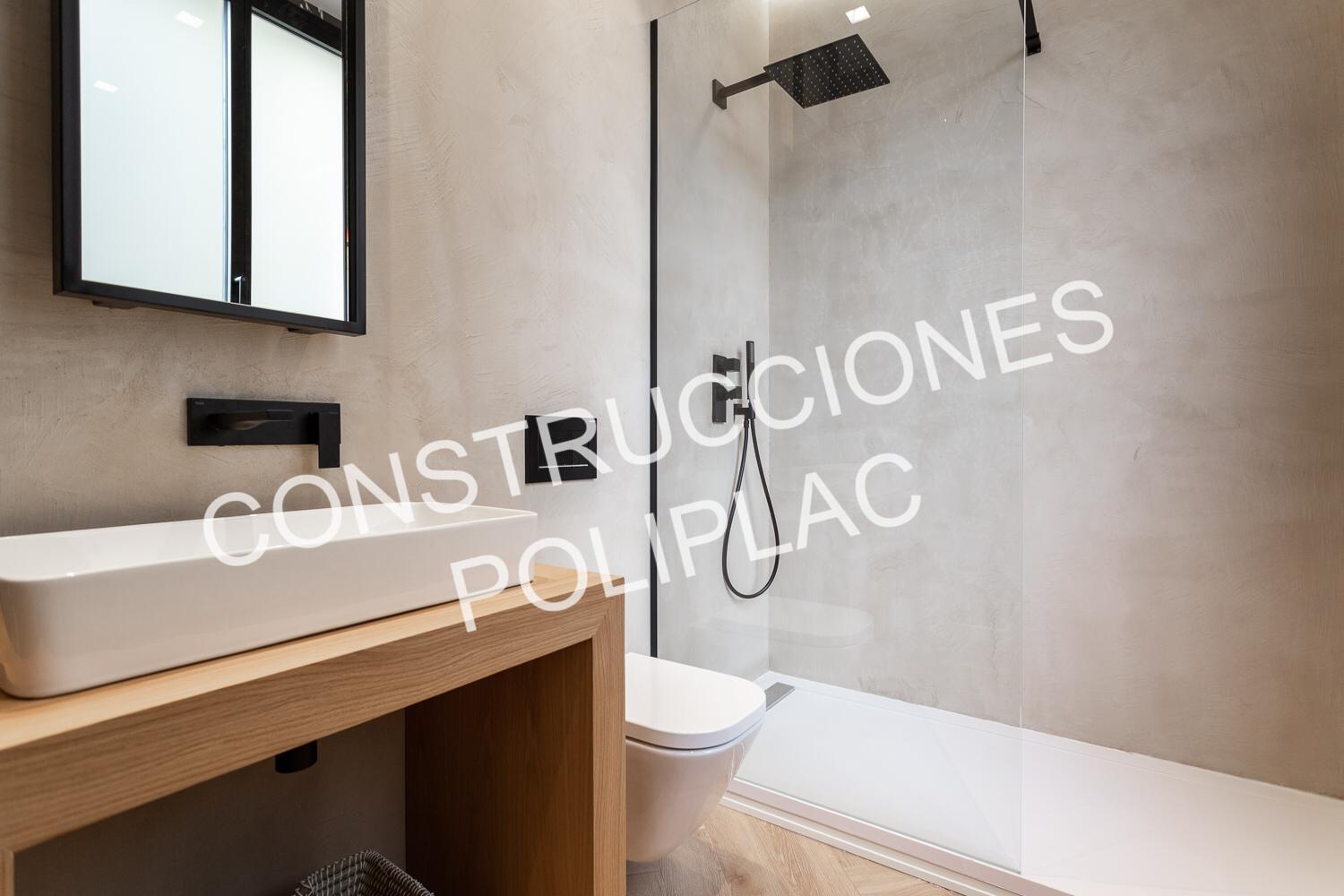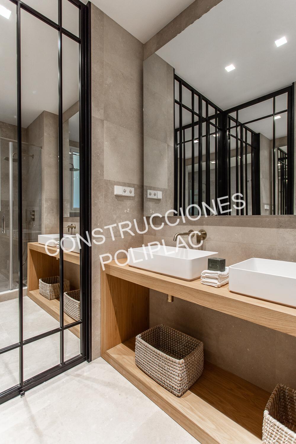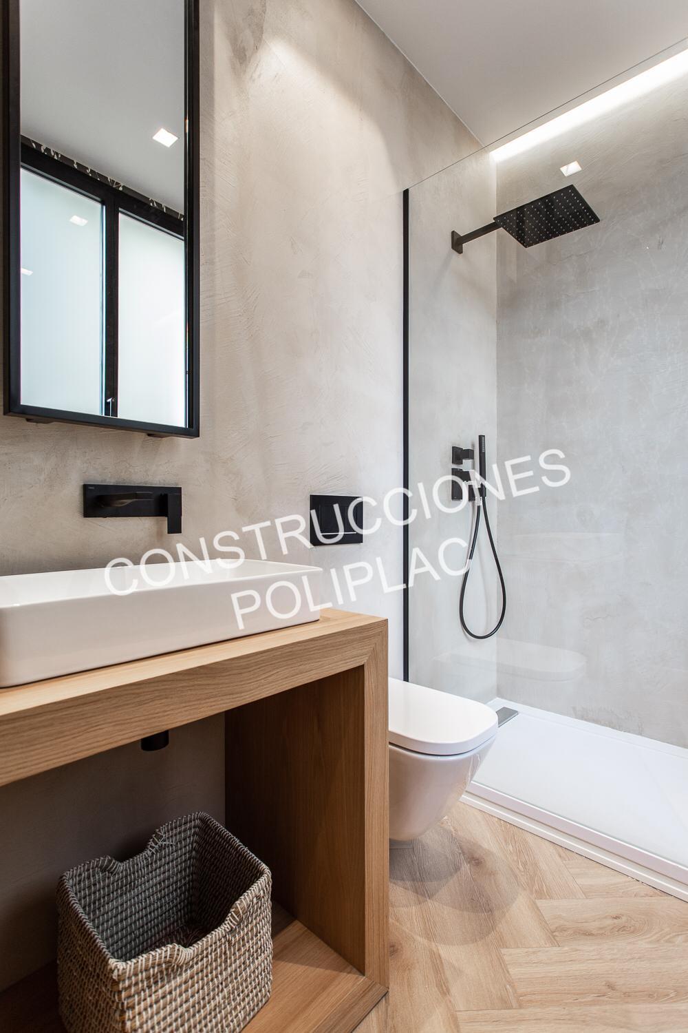 BAÑOS: SOLADO DE MADERA NATURAL COLOCADA A ESPIGA Y PIEDRA CAMPAMPERO, TABIQUERIA DE PLADUR DE 122MM CON DOS PLACAS DE 13 POR CADA CARA Y TRASDOSADOS DE 72MM CON DOS PLACAS DE 13, TECHOS DE PLADUR CON FOSAS PARA LUCES LED CON MOLDURA DE ESCAYOLA, GRIFERIA EMPOTRADA, ALICATADOS CON BALDOSAS HIDRAULICAS Y PAREDES TERMINADAS EN MORTES.