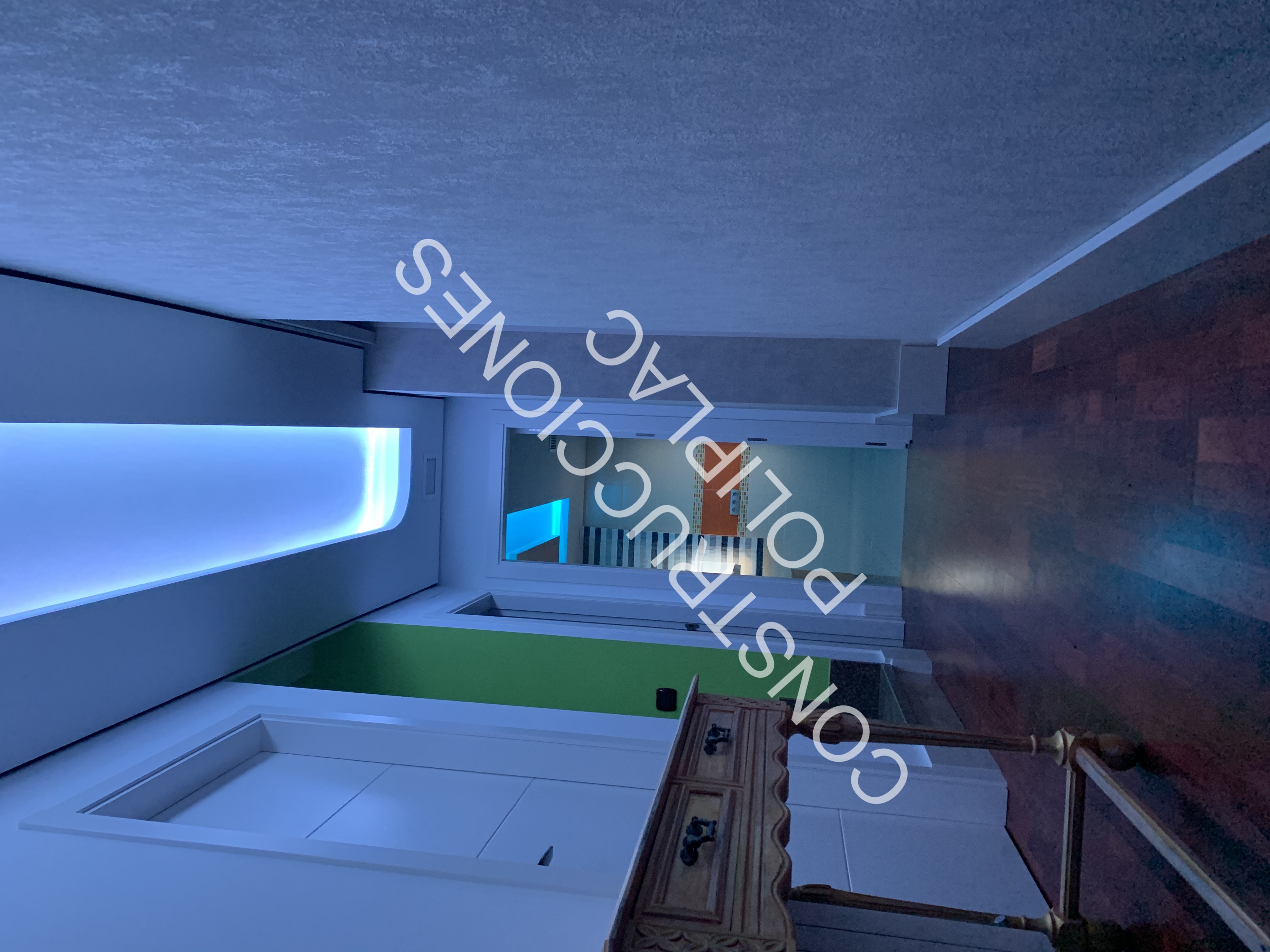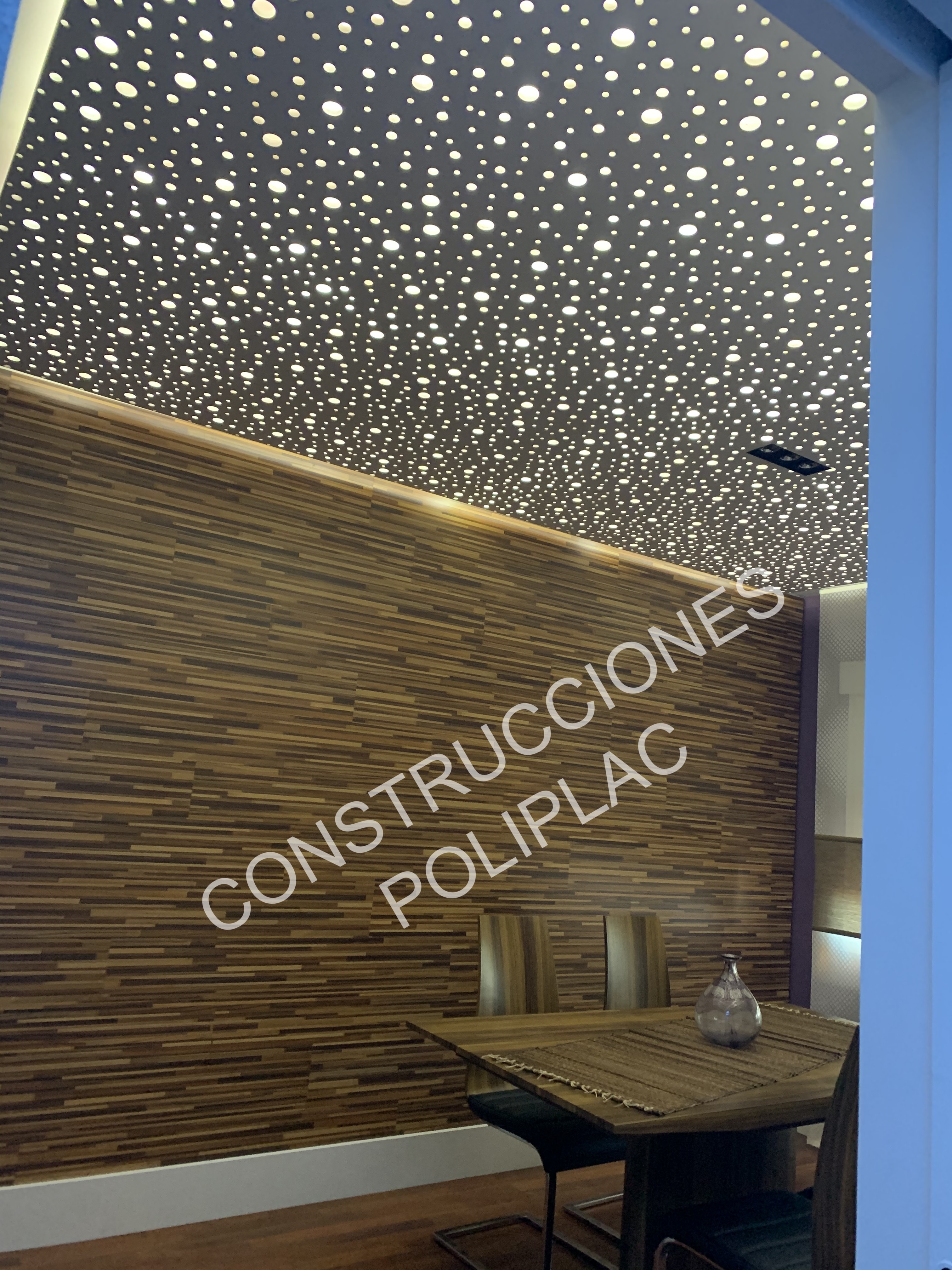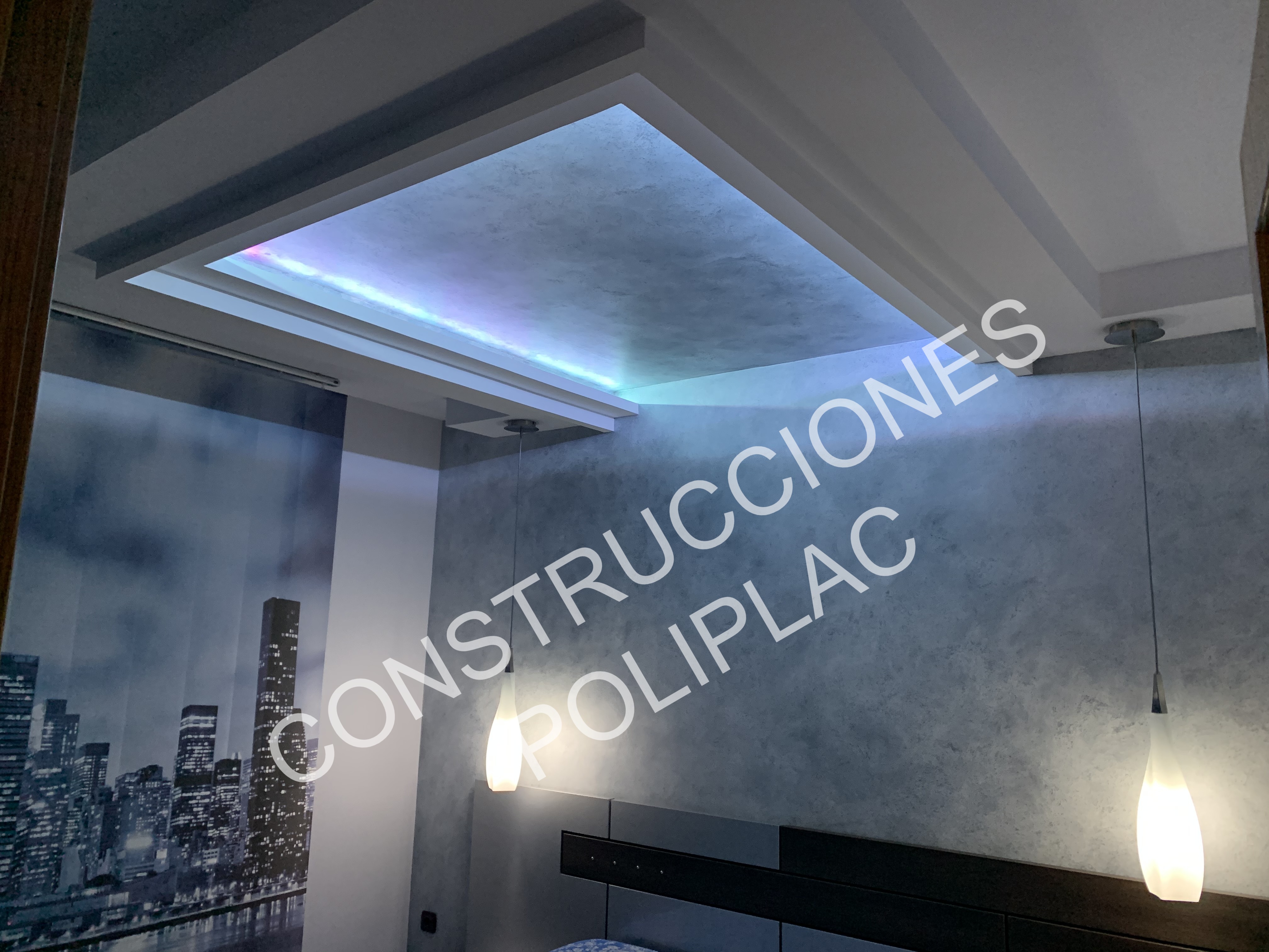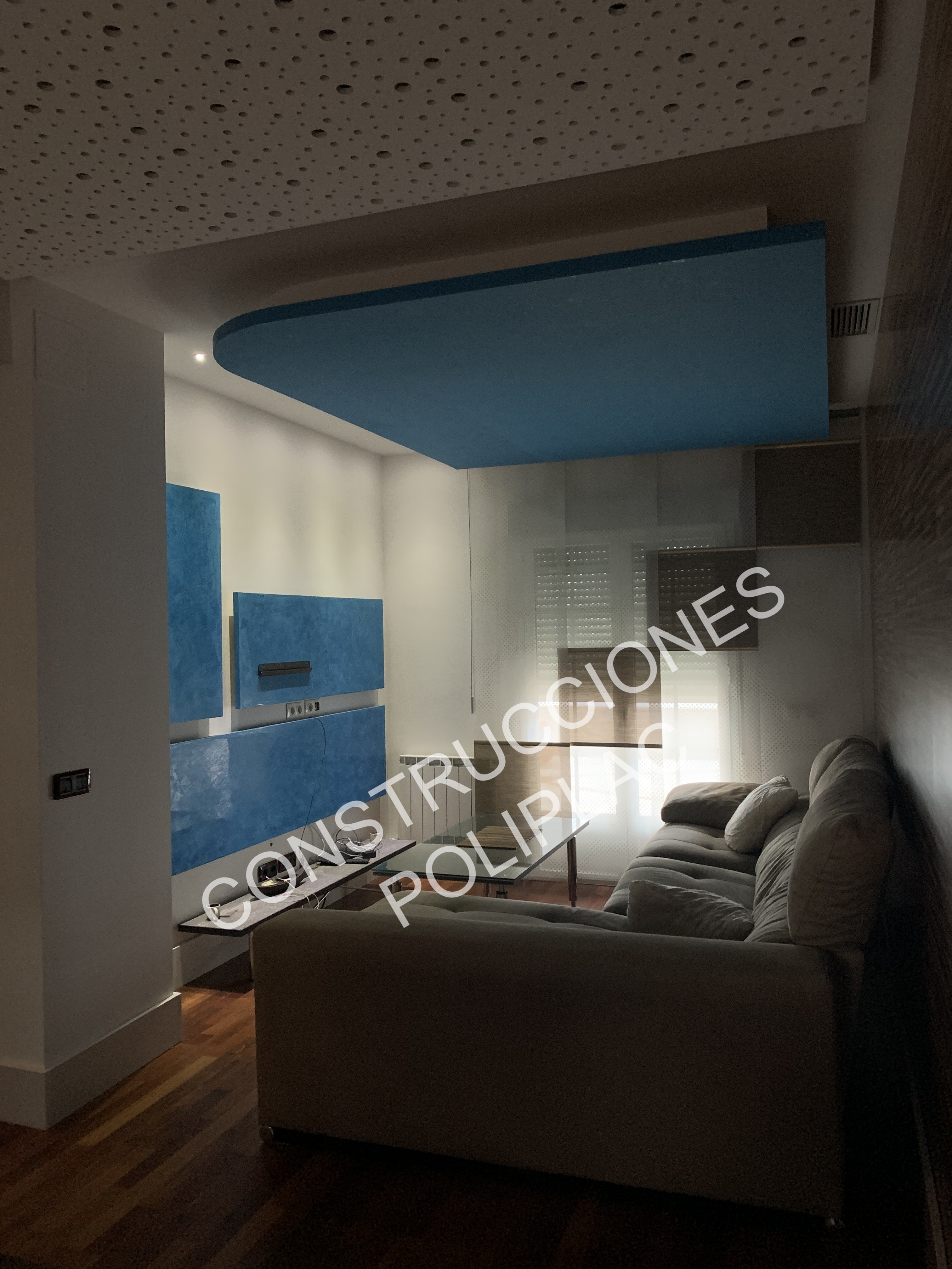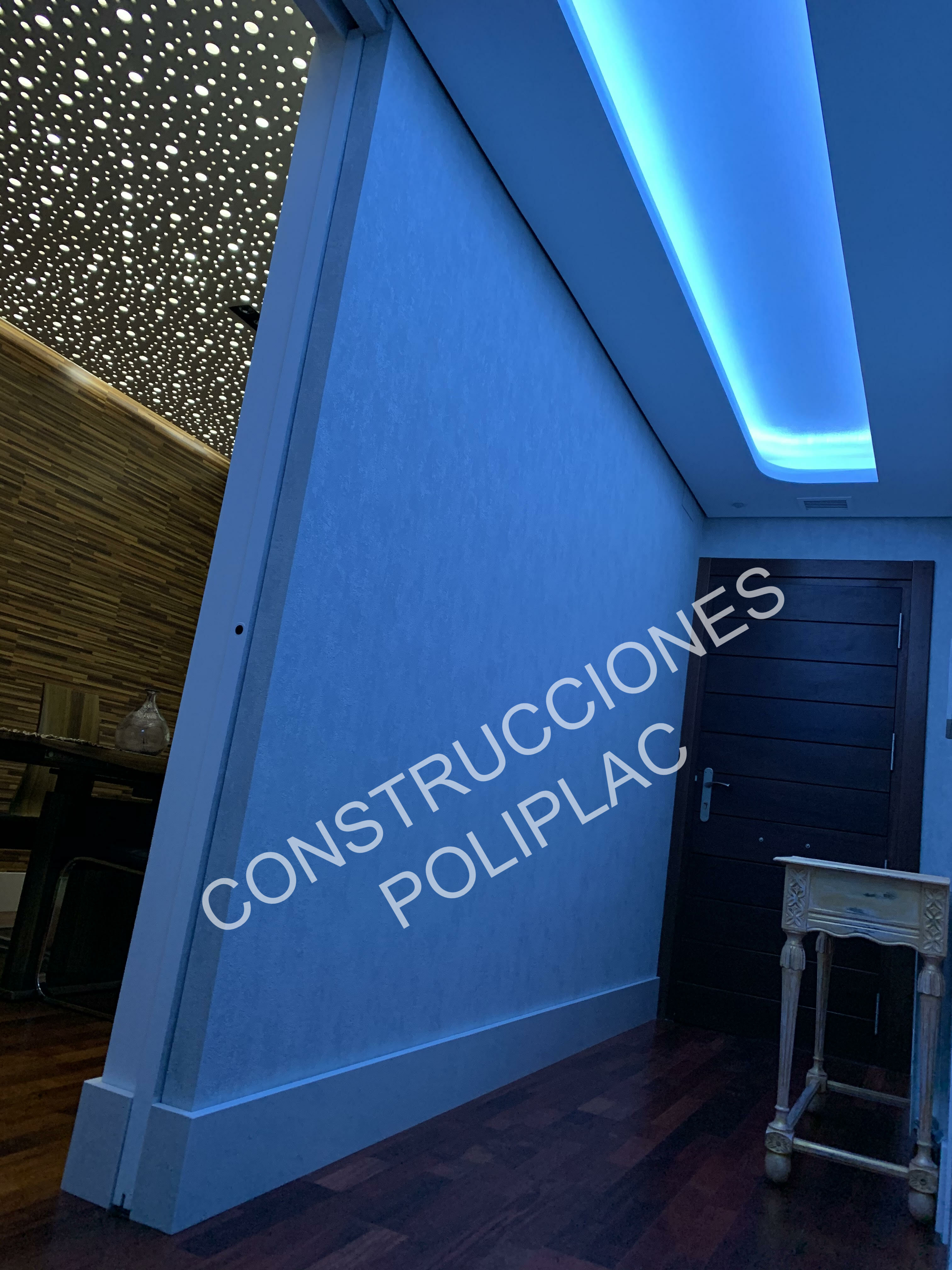 SALON: COLOCACION DE TARIMA JUNCKER CON CLIPS, TRASDOSADOS EN PARED CON REVESTIDOS IMITACION MADERA, ZOCALO DE SILESTONE DE 19CM, TECHOS DE PLADUR CON FOSA DE LED Y CIELO ESTRELLADO CON LUZ, DISEÑOS EN LA PARED CON ESTUCO DE PLADUR AZUL.