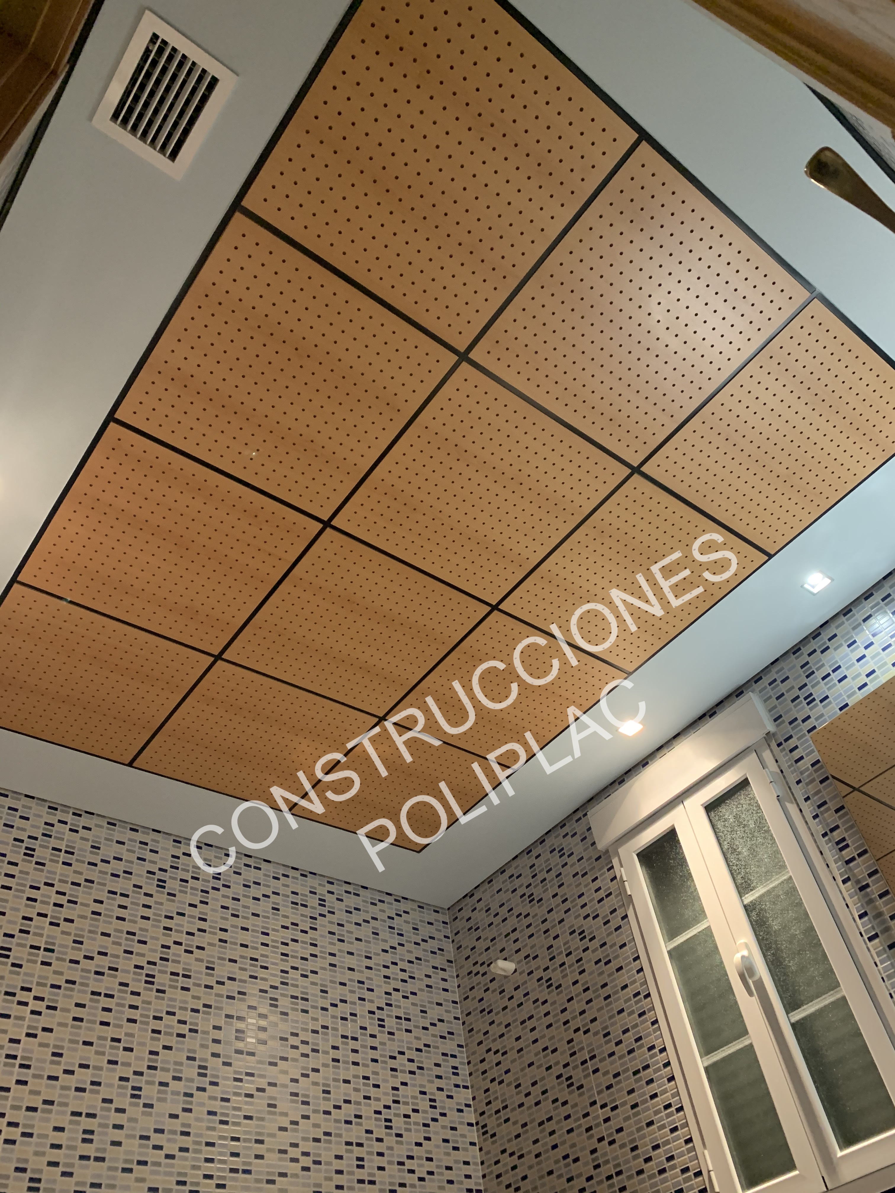 BAÑOS: TECHO DESMONTABLE DE MADERA Y ALICATADO DE MATERIAL PORCELANICO.
