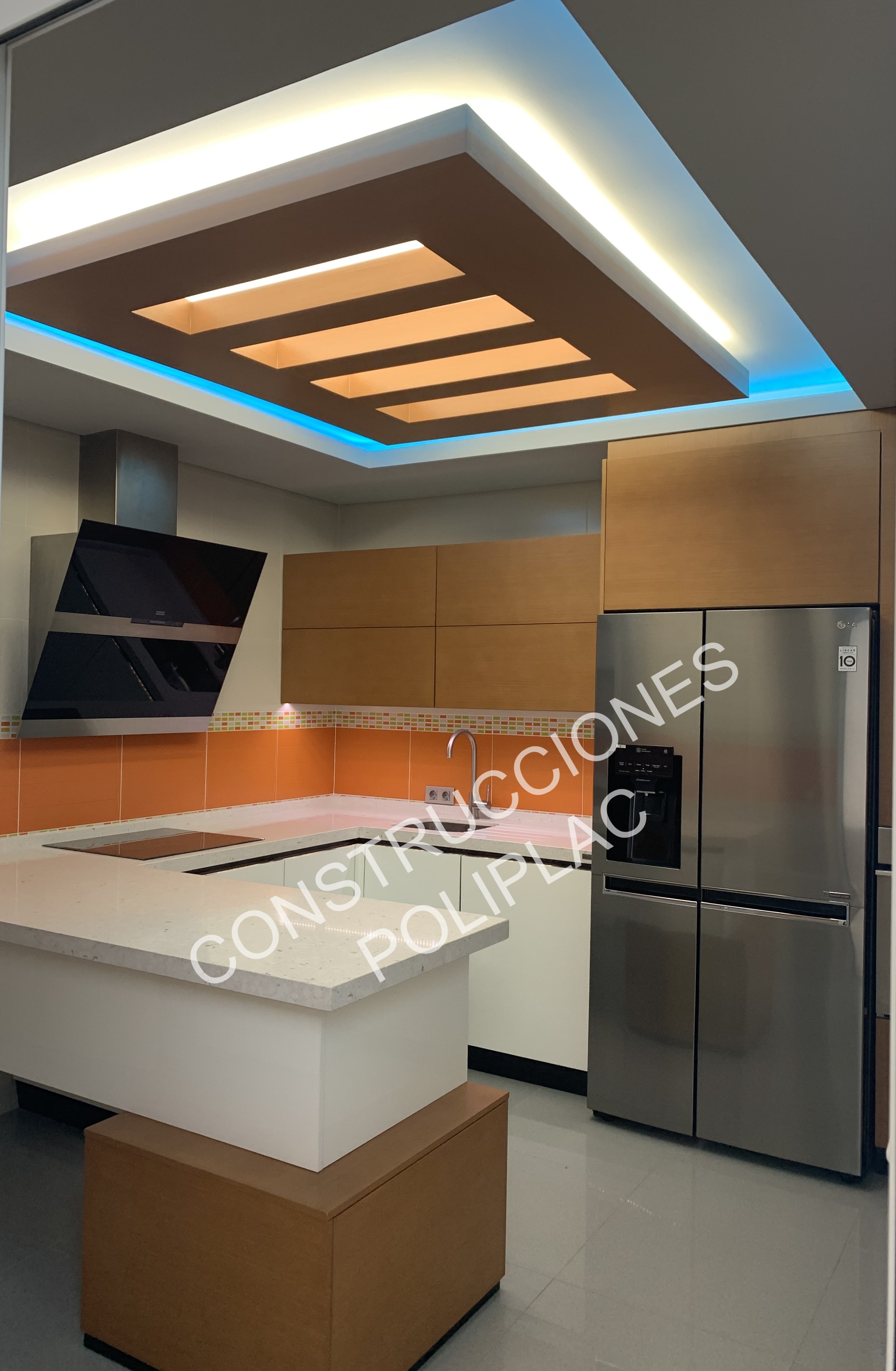 COCINA: DISEÑO ARTICO, CON TECHOS DE PLADUR PINTADOS IMITACION MADERA Y FOSAS DE LED, SOLADO DE 60X60 DE PORCELANICO RECTIFICADO.