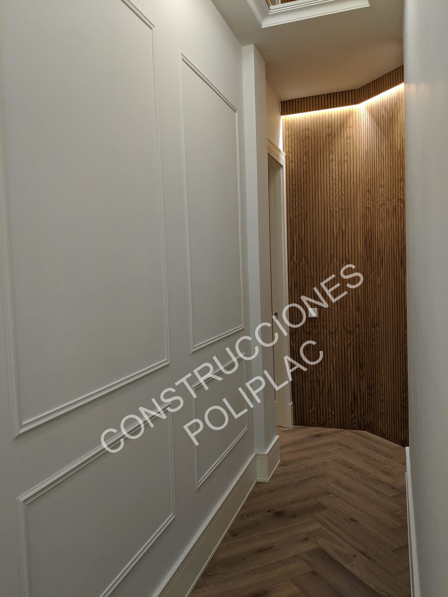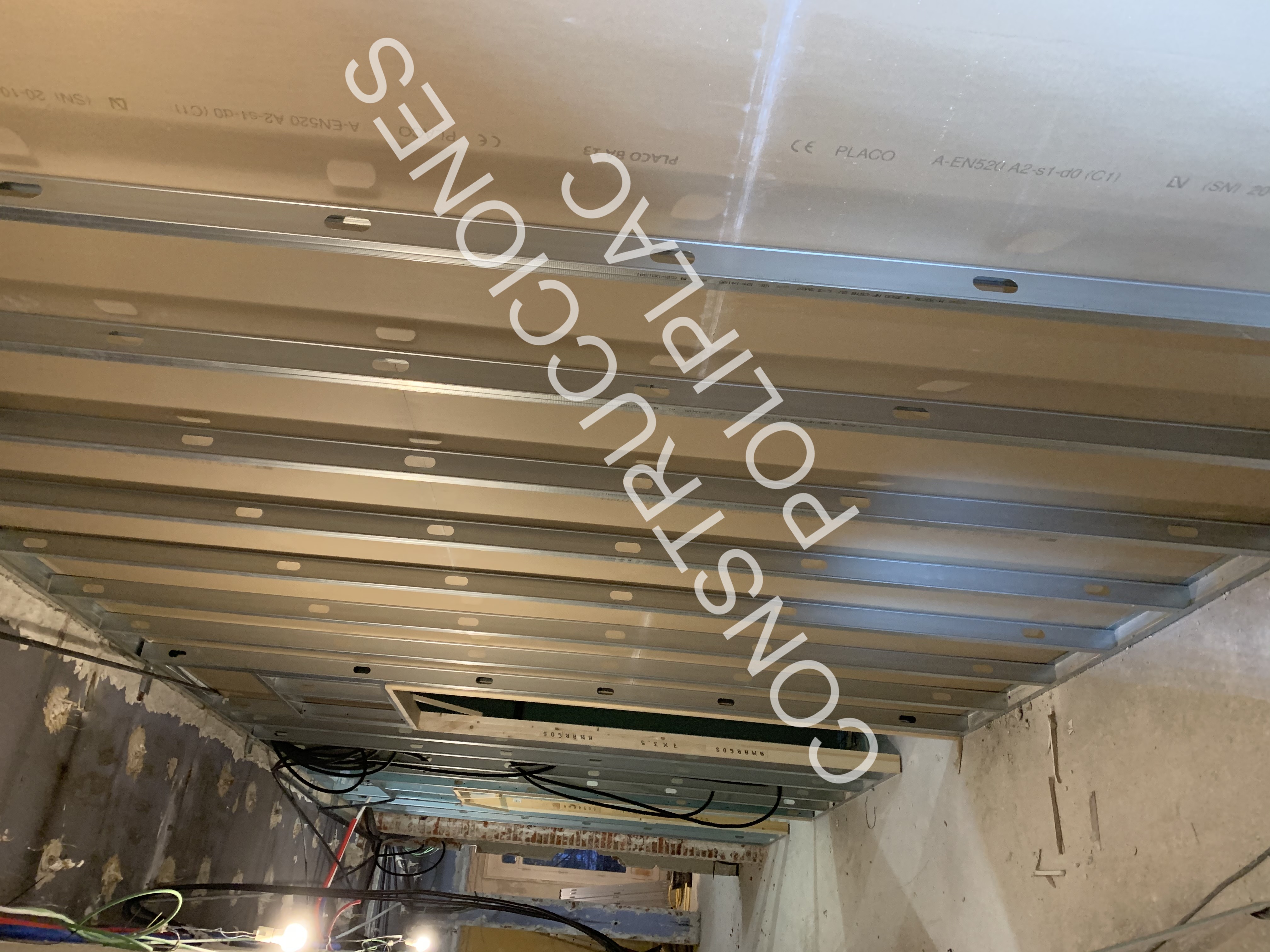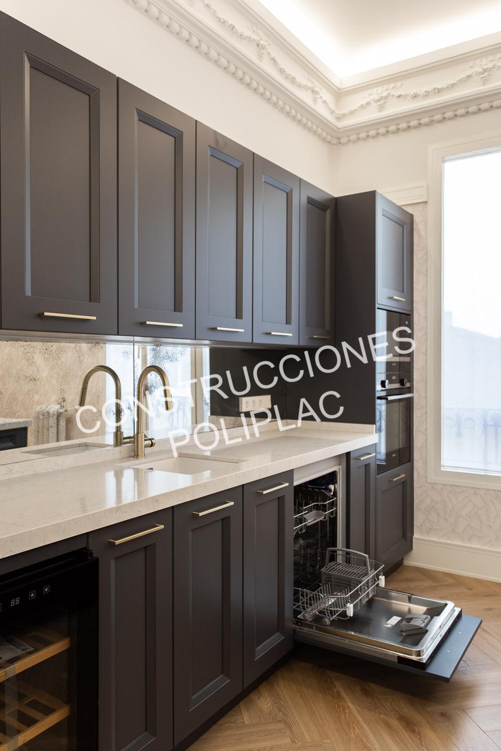 COCINA: SOLADO DE MADERA NATURAL COLOCADA A ESPIGA,TABIQUERIA DE PLADUR DE 122MM CON DOS PLACAS DE 13 POR CADA CARA Y TRASDOSADOS DE 72MM CON DOS PLACAS DE 13, TECHOS DE PLADUR CON FOSAS PARA LUCES LED CON MOLDURA DE ESCAYOLA.