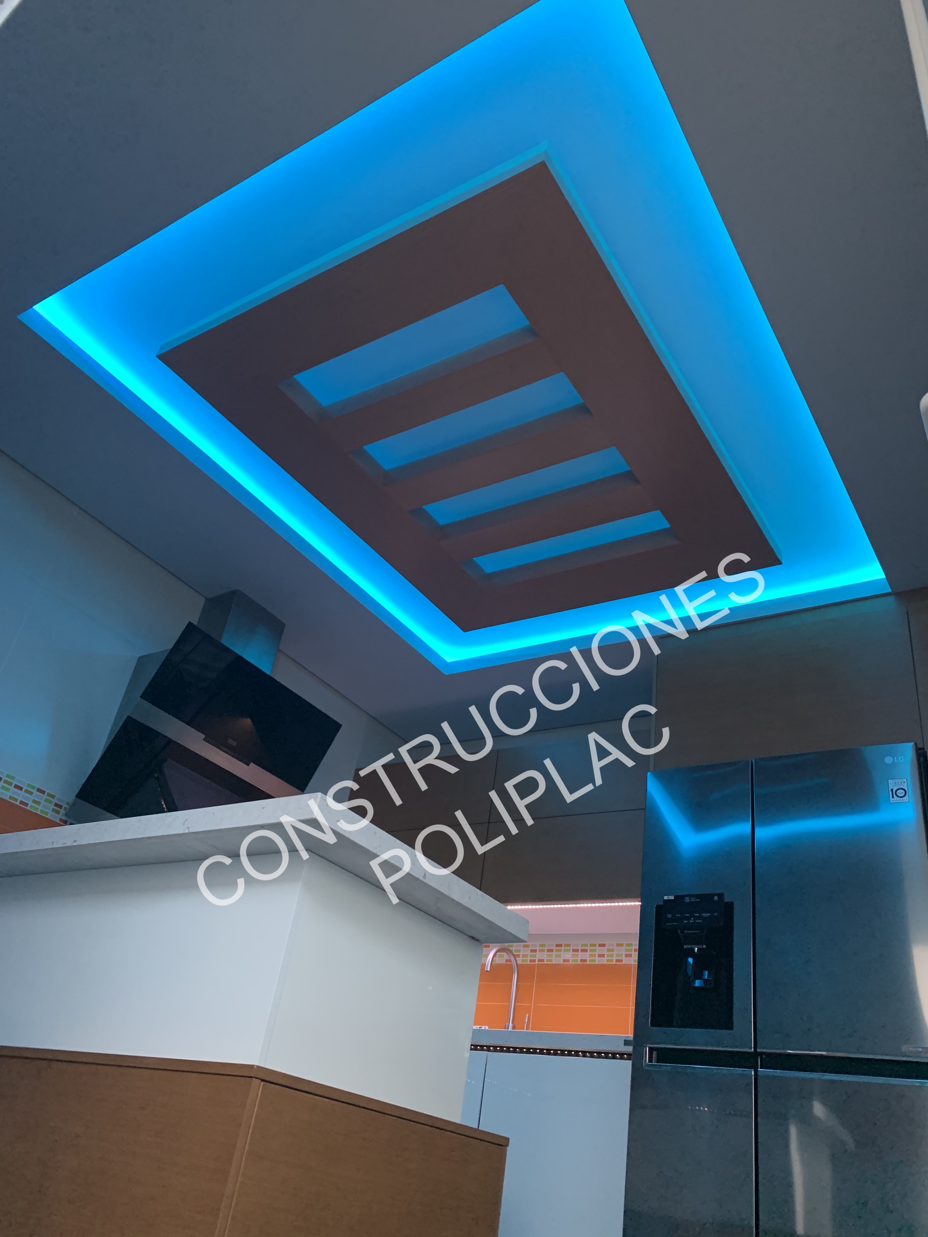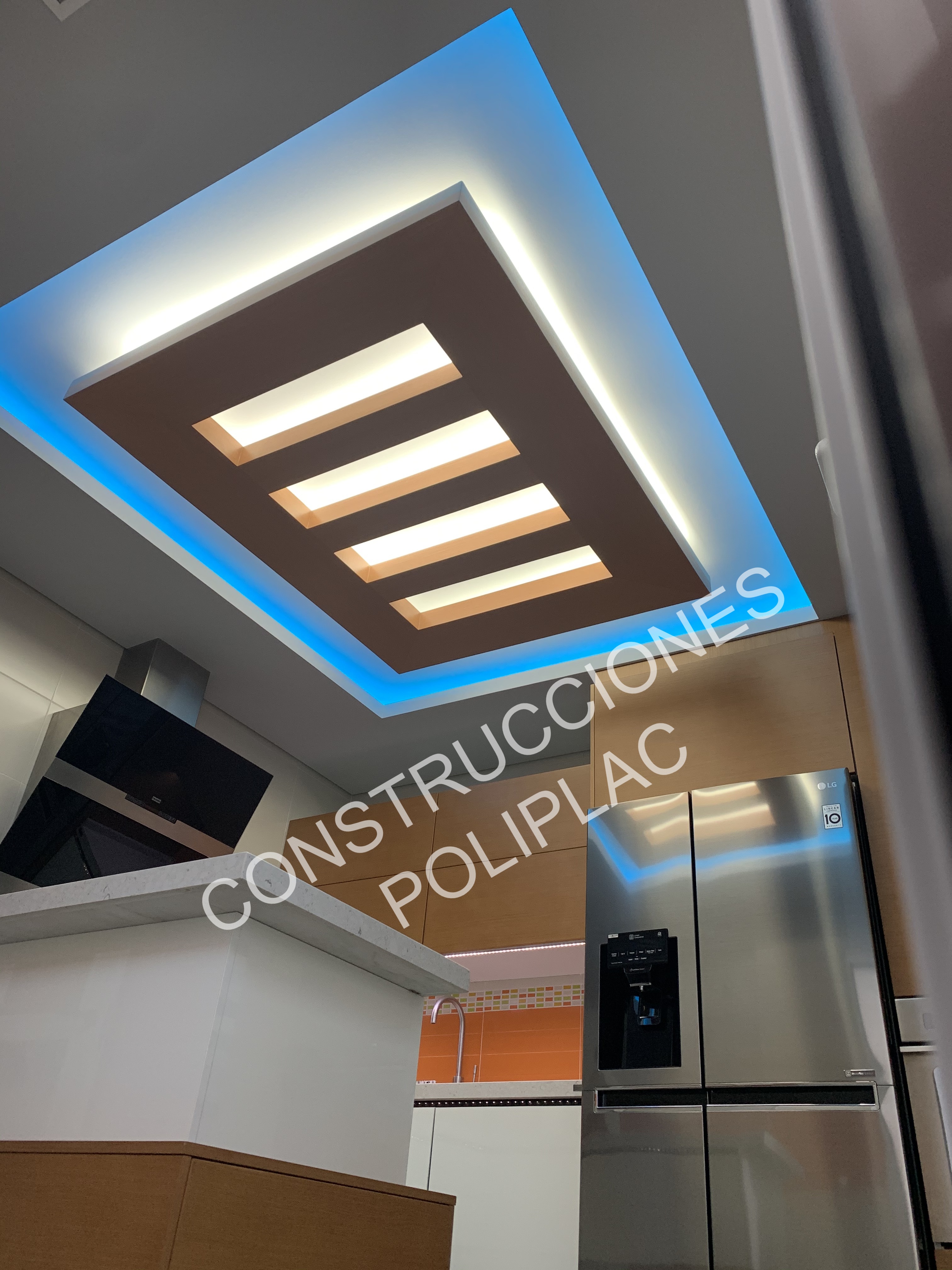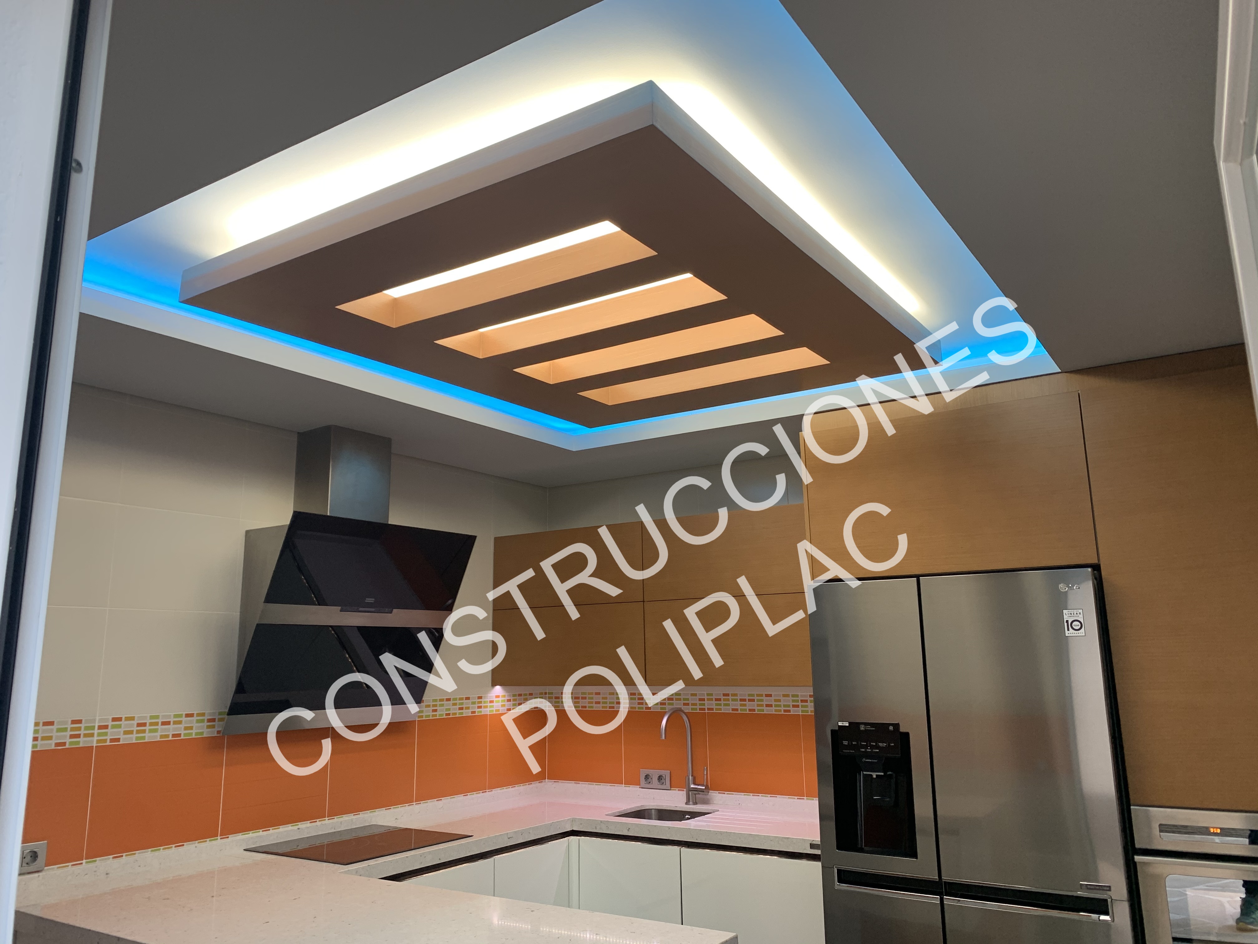 COCINA: DISEÑO ARTICO, CON TECHOS DE PLADUR PINTADOS IMITACION MADERA Y FOSAS DE LED, SOLADO DE 60X60 DE PORCELANICO RECTIFICADO.