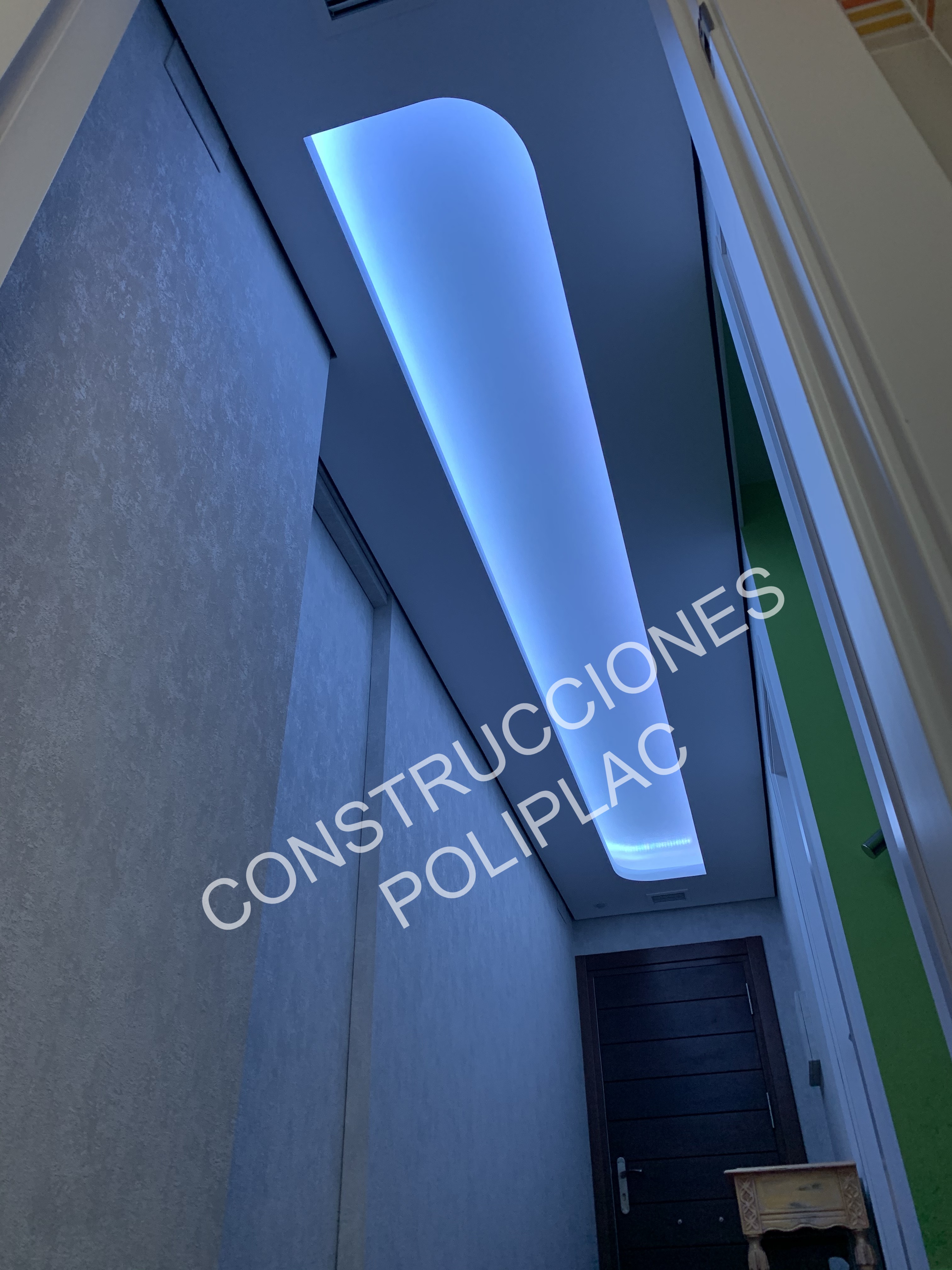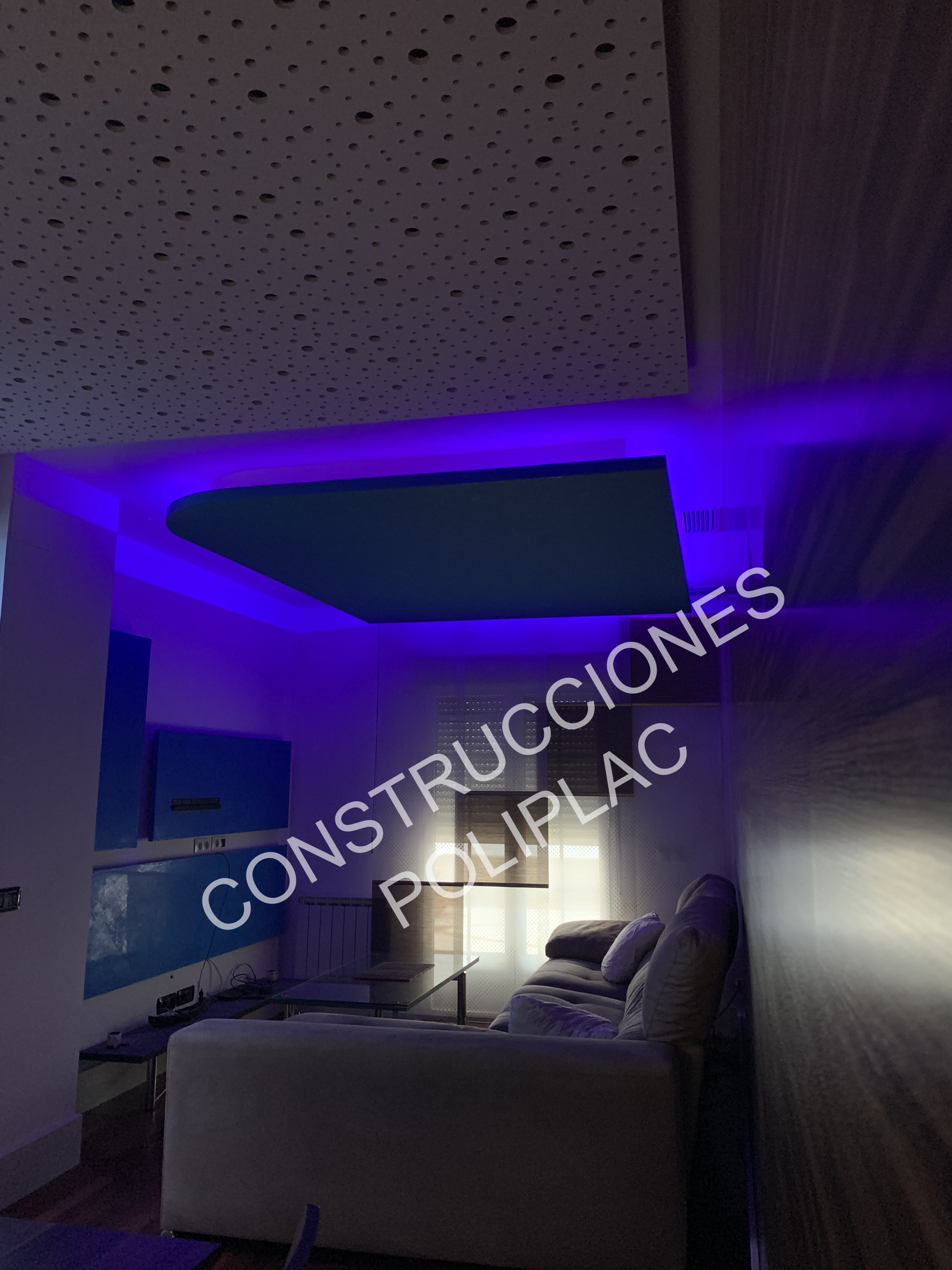 SALON: COLOCACION DE TARIMA JUNCKER CON CLIPS, TRASDOSADOS EN PARED CON REVESTIDOS IMITACION MADERA, ZOCALO DE SILESTONE DE 19CM, TECHOS DE PLADUR CON FOSA DE LED Y CIELO ESTRELLADO CON LUZ, DISEÑOS EN LA PARED CON ESTUCO DE PLADUR AZUL.