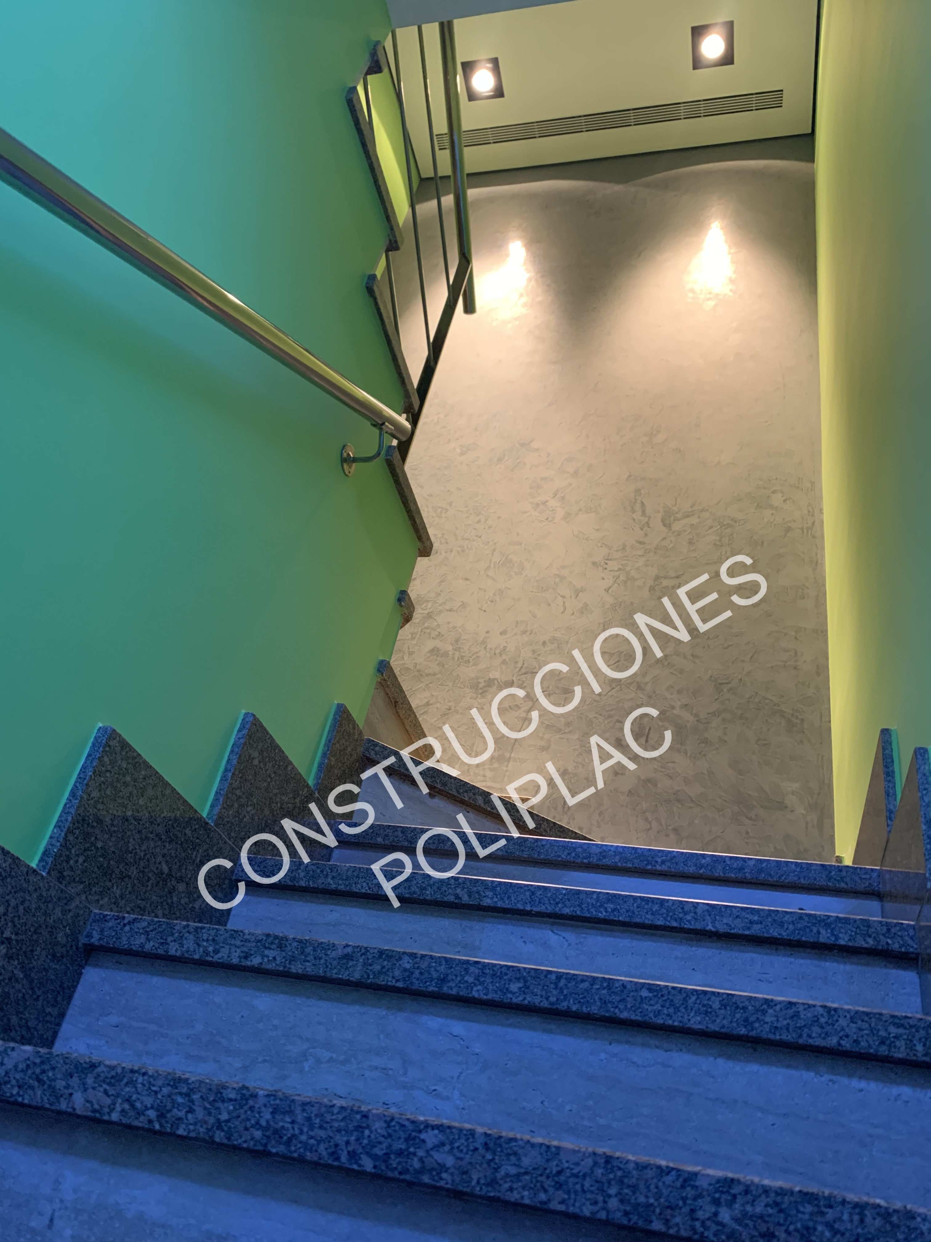 ESCALERA: TIRO DE ESCALERA DE HUELLA DE GRANITO CON TABICA DE MARMOL Y ESCALERA DE HIERRO FUNDIDO CON LATERAL DE ESTUCO GRIS.